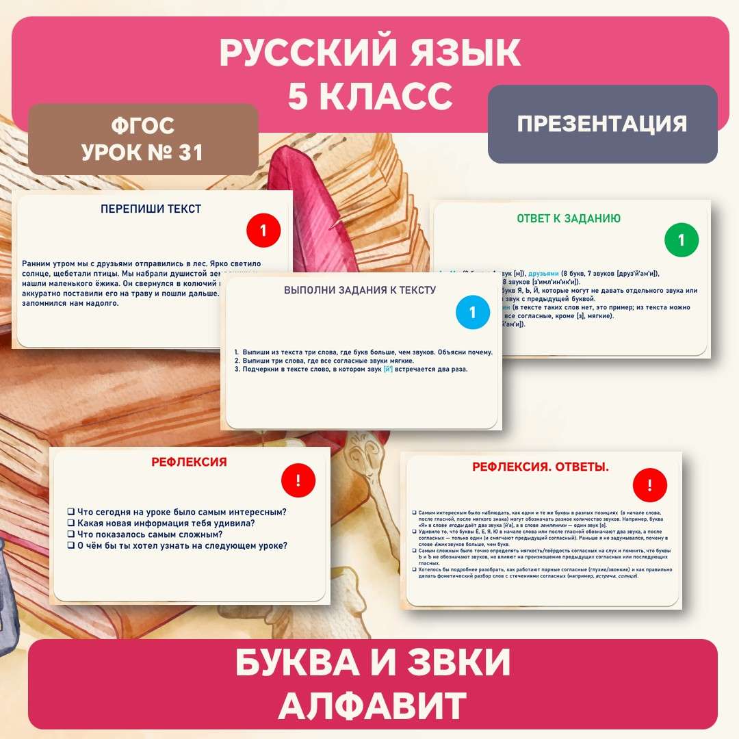 Презентация. «Буква и звук. Алфавит». Русский язык 5 класс. Урок №31. Повторяем фонетику на уроке «Буква и звук. Алфавит» в 5 классе. Это занятие поможет ученикам чётко разграничить понятия «буква» и «звук», повторить русский алфавит и классификацию звуков. Через анализ текста и выполнение трёх практических заданий школьники научатся проводить звуко-буквенный разбор. Урок завершается рефлексией для закрепления материала. Презентация обеспечивает визуальную поддержку и улучшает усвоение темы.