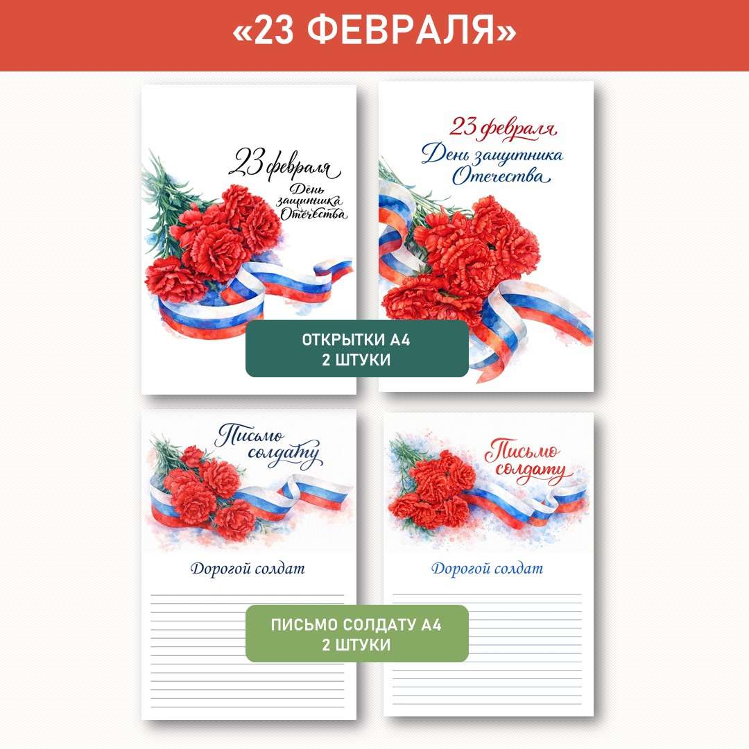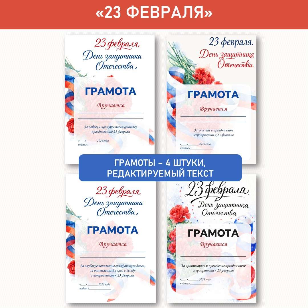 23 февраля «День Защитника Отечества». Грамоты. Поздравительный набор. Всё для 23 февраля в одном наборе: 4 именные грамоты, 6 праздничных открыток (два вида), 2 бланка письма солдату и 4 нагрудных значка. Каждый элемент — формат А4, готов к печати. Подойдёт для торжественной части, акции «Письмо солдату» и вручения наград ко Дню защитника Отечества.
