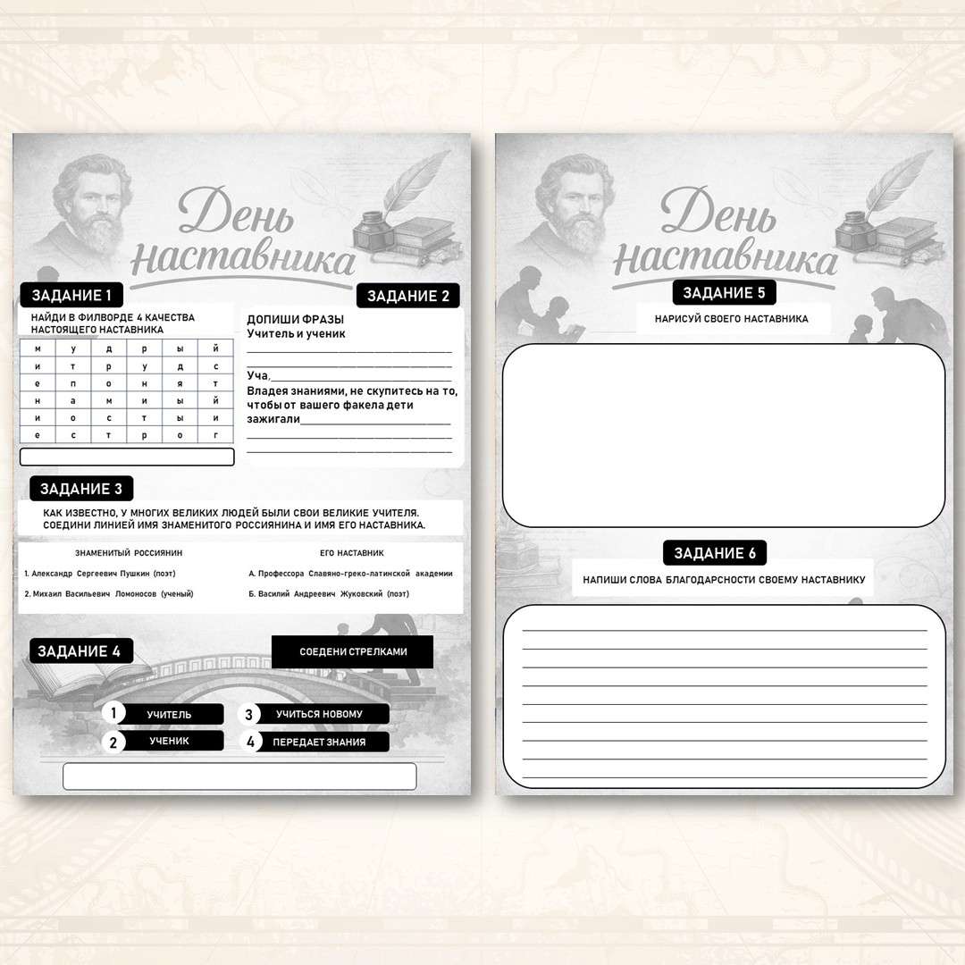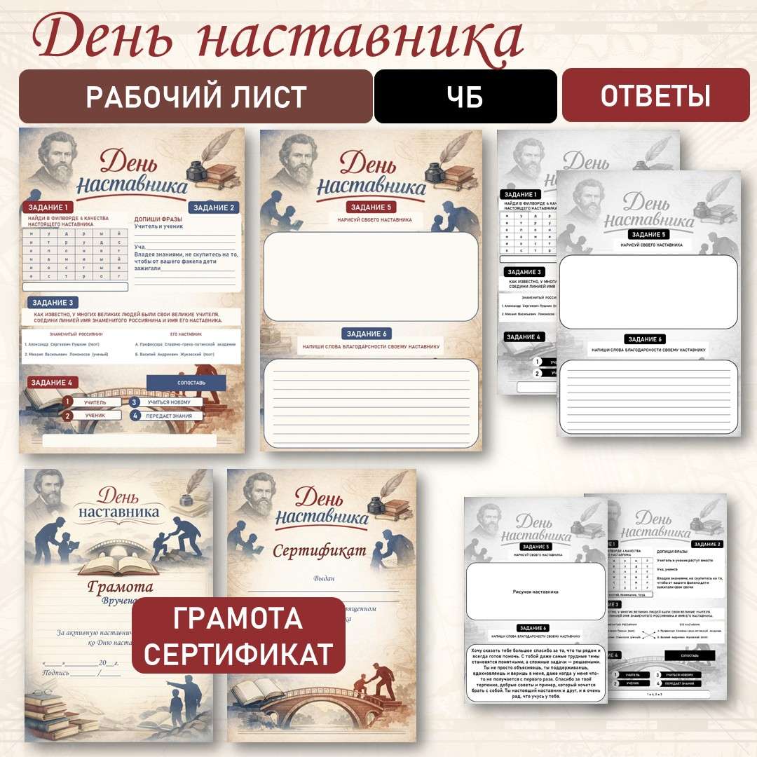 «День наставника». Разговоры о важном. (2 марта). Готовый комплект материалов: яркий цветной рабочий лист с 6 разнообразными заданиями и его черно-белая версия для удобной печати, а также полные ответы для быстрой проверки учителем. Для поощрения учеников в наборе предусмотрен красочный сертификат за участие в уроке, посвященном Дню наставника, и особая грамота за активную наставническую позицию, которую можно торжественно вручить ко Дню наставника самым инициативным ребятам. Скачайте готовый комплект, чтобы провести интересное и мотивирующее занятие, посвященное важности наставничества.