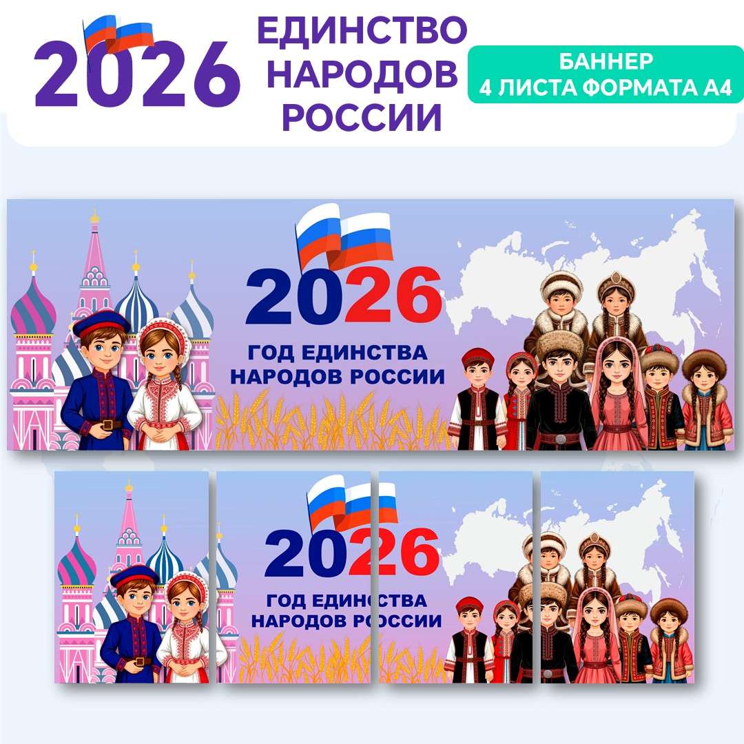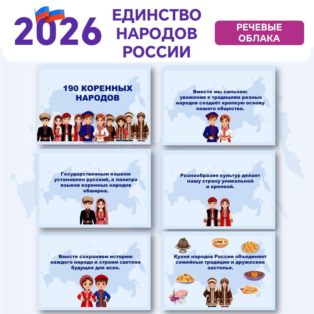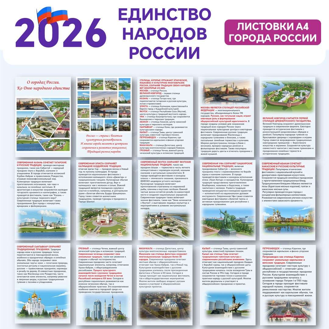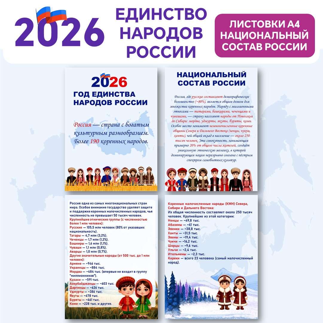 В рамках Года единства народов России 2026 представляем эксклюзивные материалы: баннер (4хА4), серию листовок и речевых облаков. Узнайте актуальные данные переписи о национальном составе РФ. Откройте для себя города России — центры культур народов Поволжья, Кавказа, Сибири и Дальнего Востока. Скачайте готовые материалы для оформления мероприятий, школ и общественных пространств, посвященных межнациональному согласию и многообразию.