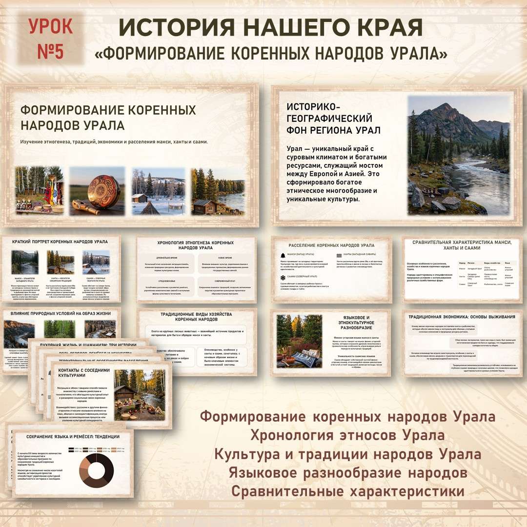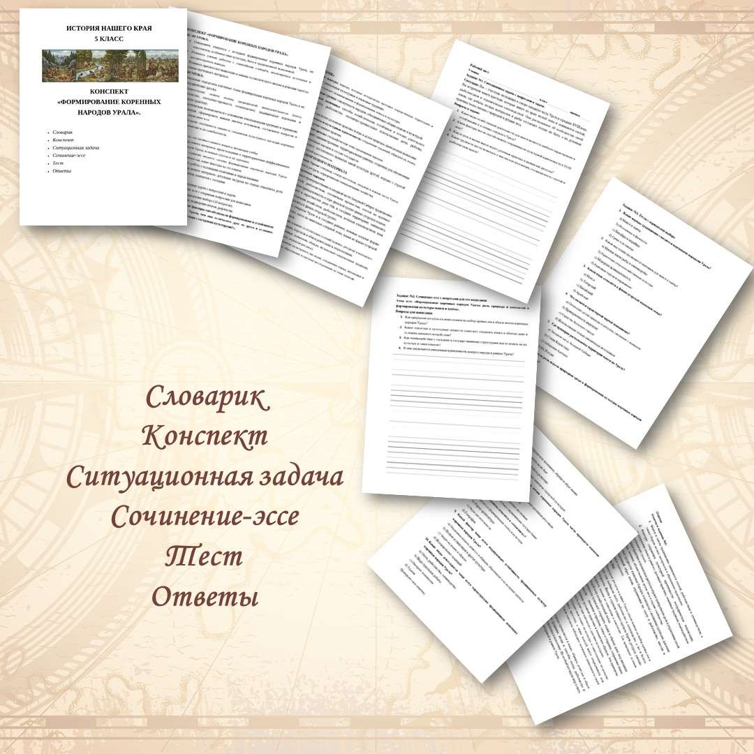 История нашего края. Конспект «Формирование коренных народов Урала». Урок №5. В набор входит подробный конспект с новым материалом и планом урока, а также презентация, иллюстрирующая хронологию, культуру, традиции и языковое разнообразие народов. Для проверки знаний предусмотрены ситуационная задача, темы эссе и раздаточный материал, а ответы на все задания и сравнительные характеристики помогут систематизировать изучение истории нашего края.
