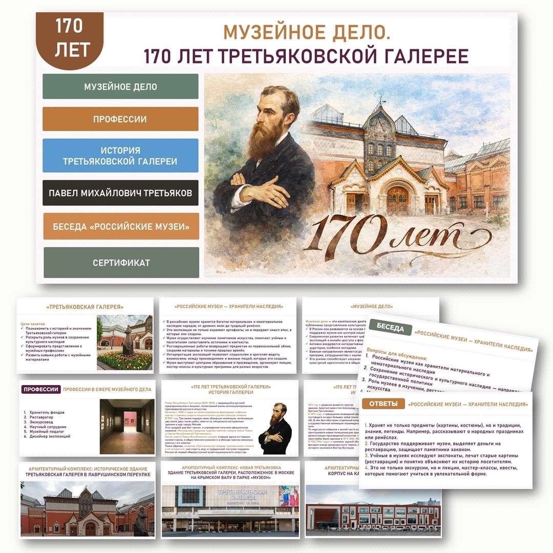 «Музейное дело. 170 лет Третьяковской галерее». Разговоры о важном (19 января). Материалы занятия «Разговоры о важном» от 19 января на тему «Музейное дело. 170 лет Третьяковской галерее». В программе: история галереи, жизнь Павла Третьякова, обсуждение «Российские музеи», обзор музейных профессий и полезные материалы — памятные закладки для участников. Готовый контент для классного часа.