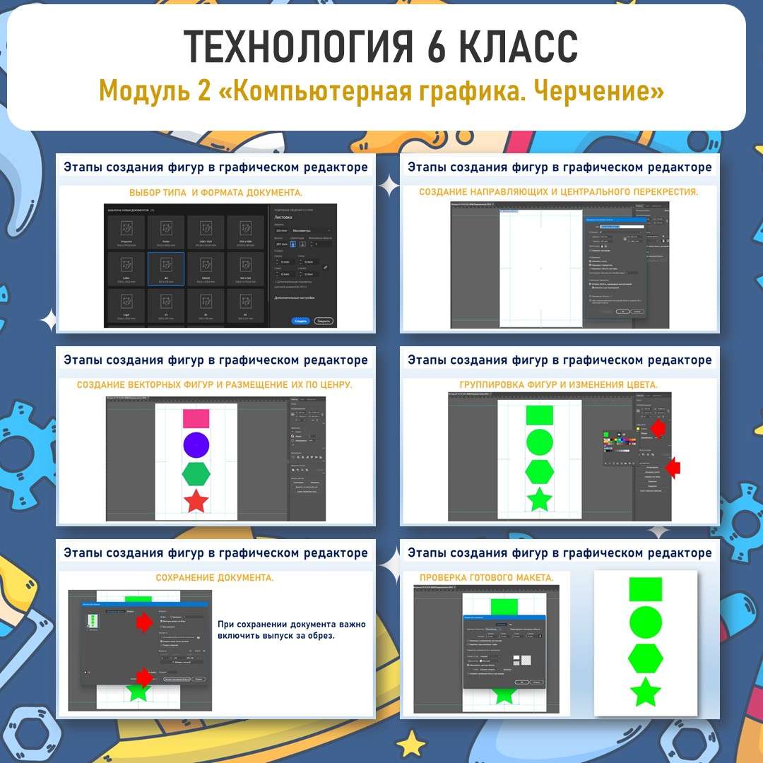 Презентация и практическая «Печатная продукция как результат компьютерной графики». Труд (технология) 6 класс. Уроки 9, 10.  В материалы включены теория о печатной продукции как результате компьютерной графики, а также практические задания: построение фигур и создание печатной продукции в графическом редакторе. Подходит для развития творческих и технических навыков у учащихся.